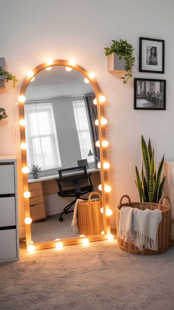 Here’s an underrated trend I’m thrilled to see making a comeback—decorative mirrors. They’re not just practical; they’re also one of the smartest visual tricks for small dorm rooms.