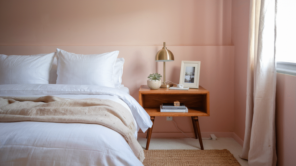 Think of blush walls paired with gold-framed mirrors, or a dusty-pink duvet accented by brass bedside lamps. I once styled a small studio with pale pink curtains and rose gold drawer pulls, and let me tell you, the whole place looked like it came straight out of a boutique hotel.