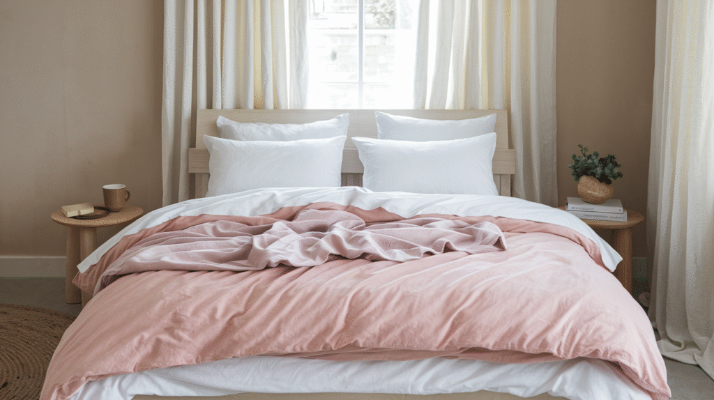 - Blush linen sheets that feel light and calming