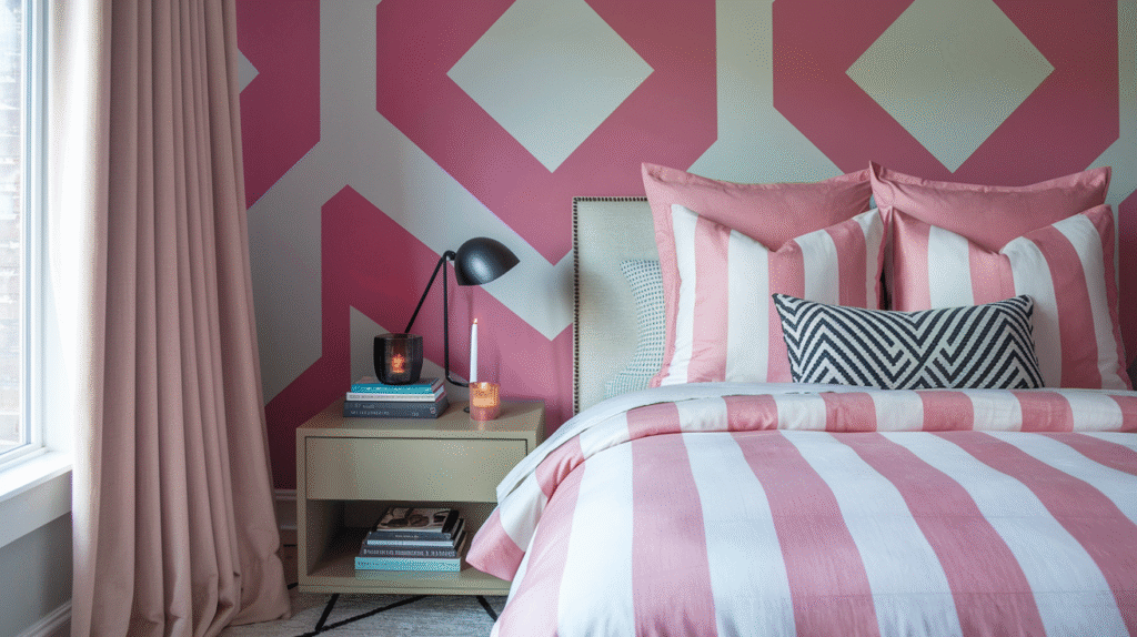 One of my favorite looks is a pink-and-white striped duvet paired with solid blush curtains. It feels lighthearted but still grown-up. On the flip side, I’ve also used bold geometric wallpaper with pink accents in a client’s loft bedroom, and it gave the space this artsy, Instagram-worthy edge.