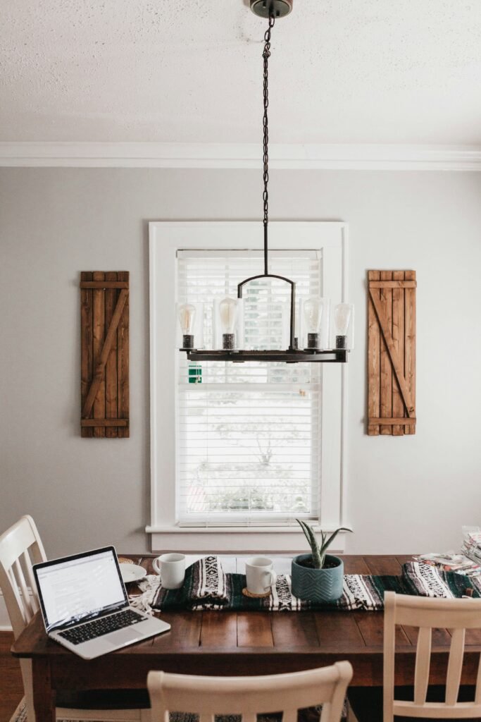 Picture this: white shiplap or painted walls, a distressed wood dining table, mismatched chairs in soft whites and creams, and a farmhouse chandelier hanging overhead. Add a simple linen runner and a vase of fresh greenery, and you’ve got a space that screams “gather here.”