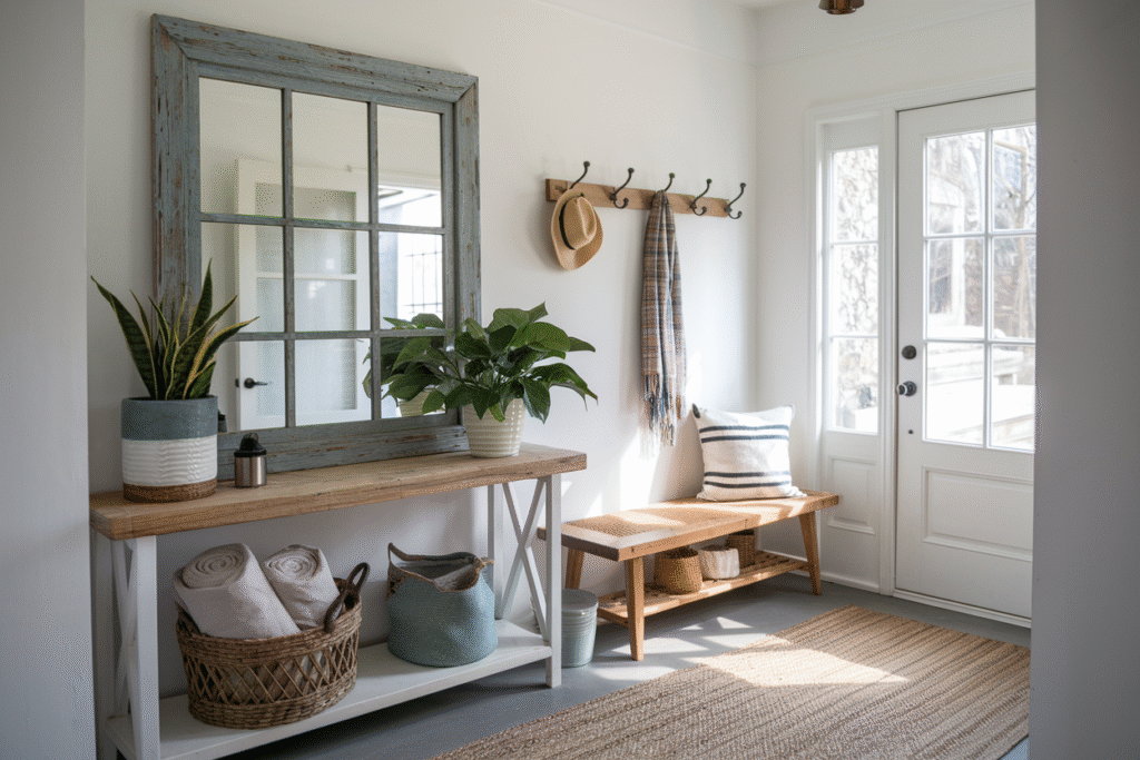 Start with clean white walls (of course) and add a rustic console table. Throw in a woven basket for shoes, a few hooks for coats, and a large mirror to bounce the light around. Bonus points if you add a farmhouse-style bench with cozy cushions—it’s functional and stylish.