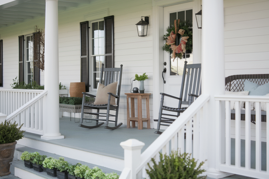 I recommend starting with white-painted railings and columns as your base. Then bring in classic farmhouse pieces like rocking chairs, a wooden swing, or wicker seating layered with soft cushions. Don’t forget potted greenery or even a seasonal wreath on the door—it’s these little details that make the space pop.