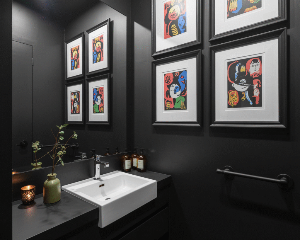 This one’s for the creatives. A black powder room is the perfect backdrop for artwork. I’ve seen clients hang oversized, colorful art pieces, and the black walls instantly make them pop.