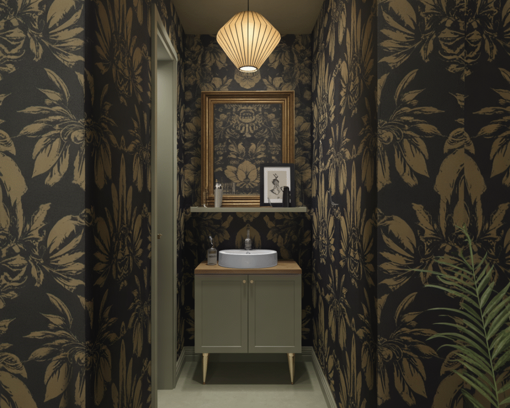 I once styled a black powder room with oversized gold floral wallpaper, and honestly, it felt like stepping into a piece of art. Guests couldn’t stop talking about it.