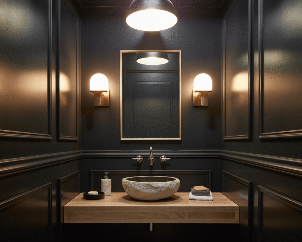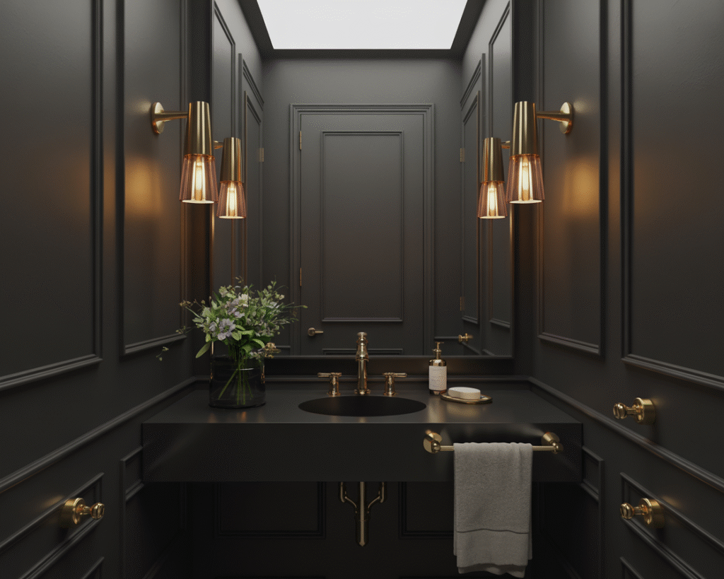 - Lighting becomes the star. In a black powder room, even a modest sconce suddenly looks like a designer piece.