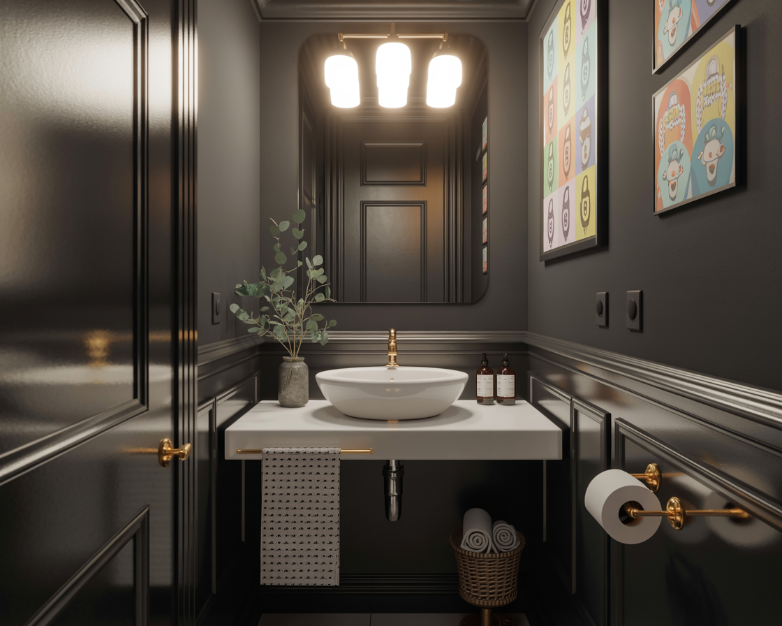 Before you grab the paint roller, let’s talk basics. According to my experience, three things can make or break a black powder room: lighting, finishes, and balance.