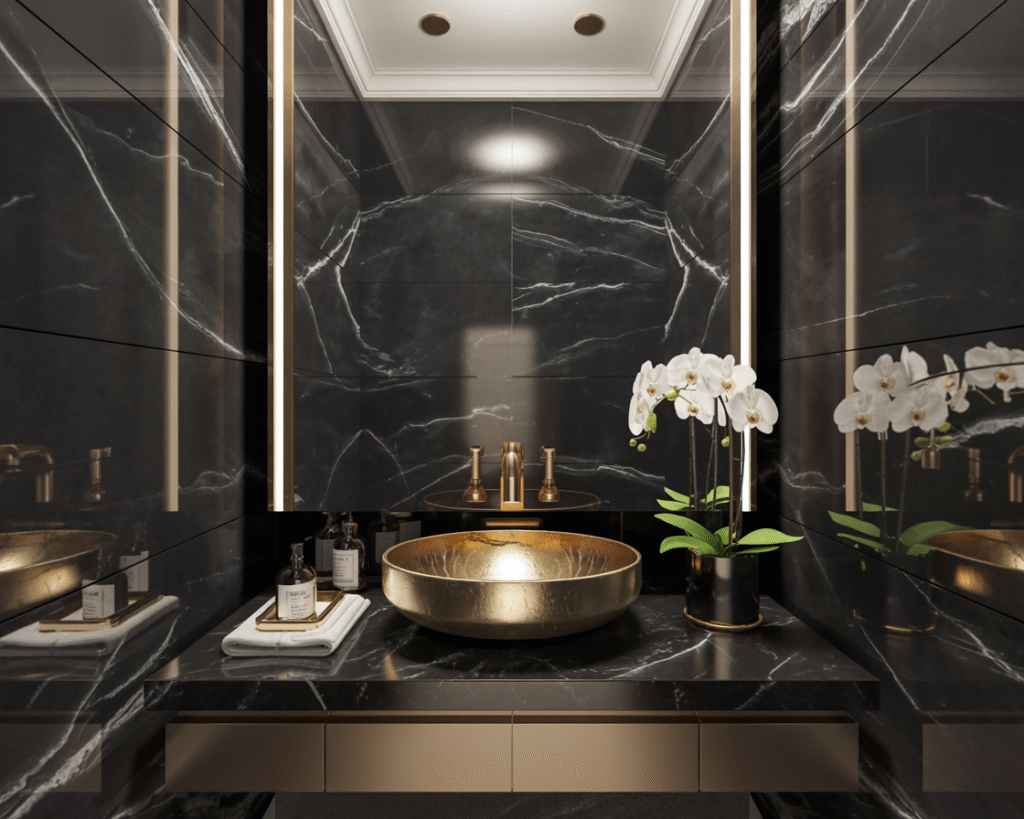 This one’s my personal favorite. Wood softens black beautifully. Whenever I’ve styled a black powder room with wood vanities or wooden ceilings, the space instantly felt warm instead of cold.