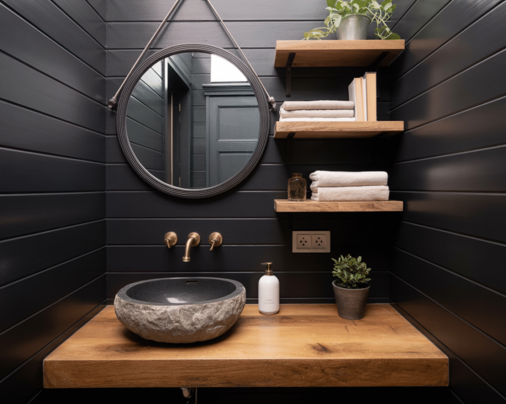 Think Scandinavian chic but with a dramatic twist. Imagine matte black walls, a rustic oak vanity, and a simple stone sink. Minimal but powerful.
