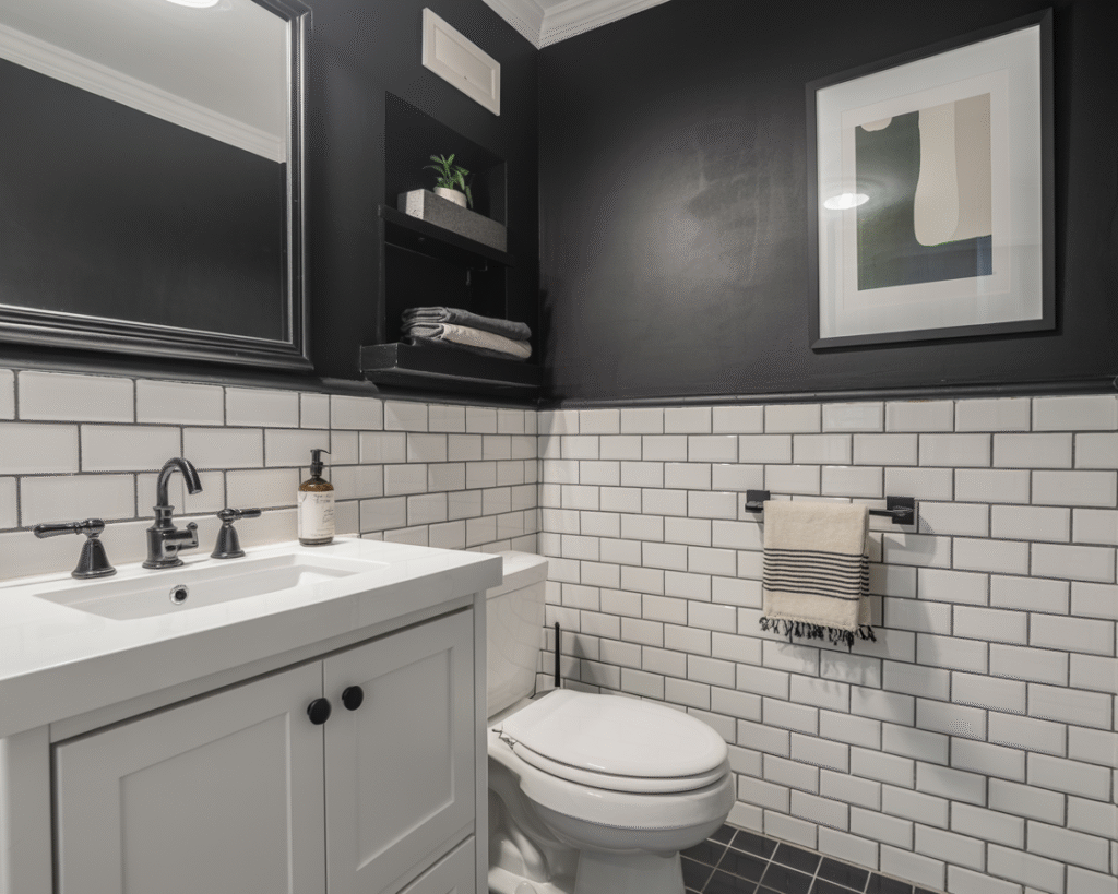 - Black walls + white vanity = bold yet balanced.