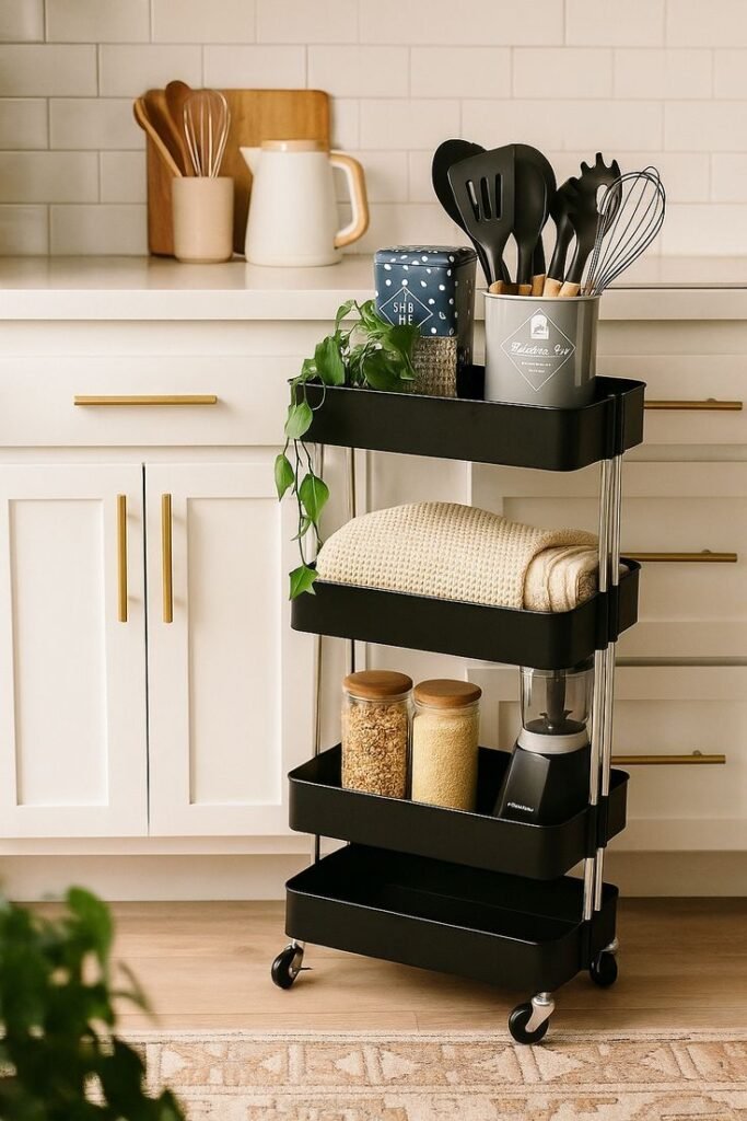 In my experience, a rolling cart keeps counters clear and reduces clutter instantly. It’s one of those simple investments that make a small kitchen feel much larger. Even better, many rolling carts come with multiple tiers, so vertical storage is built-in.