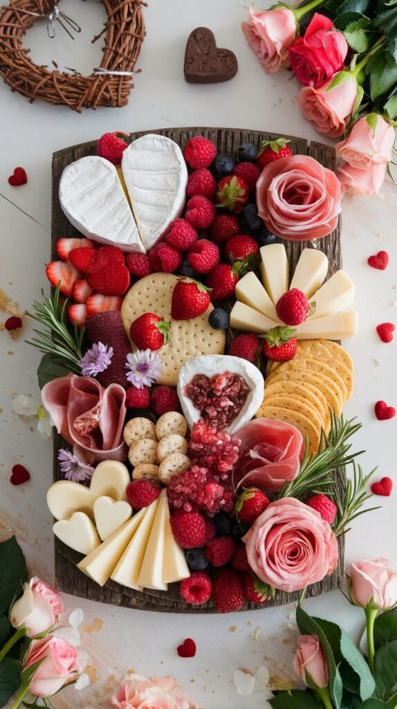 I arrange flowers around the edges to frame the board. That small detail makes everything feel elevated.