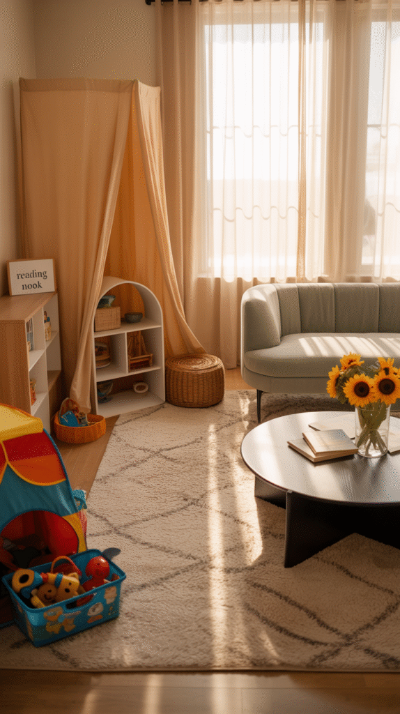 - Kid zone = soft rug, toy basket, maybe a play tent.