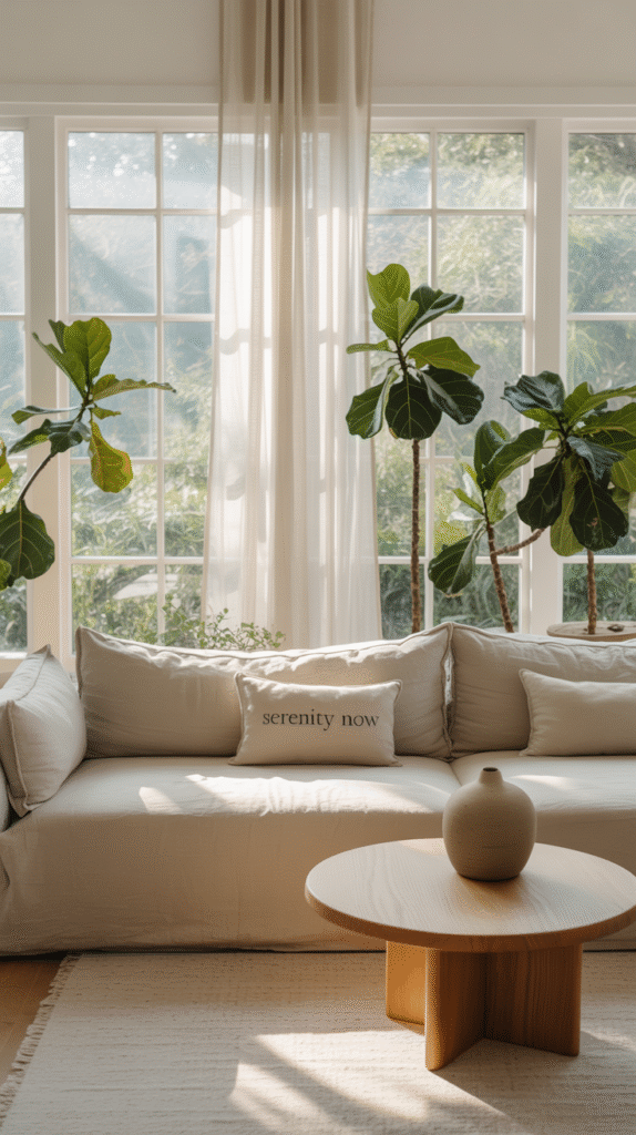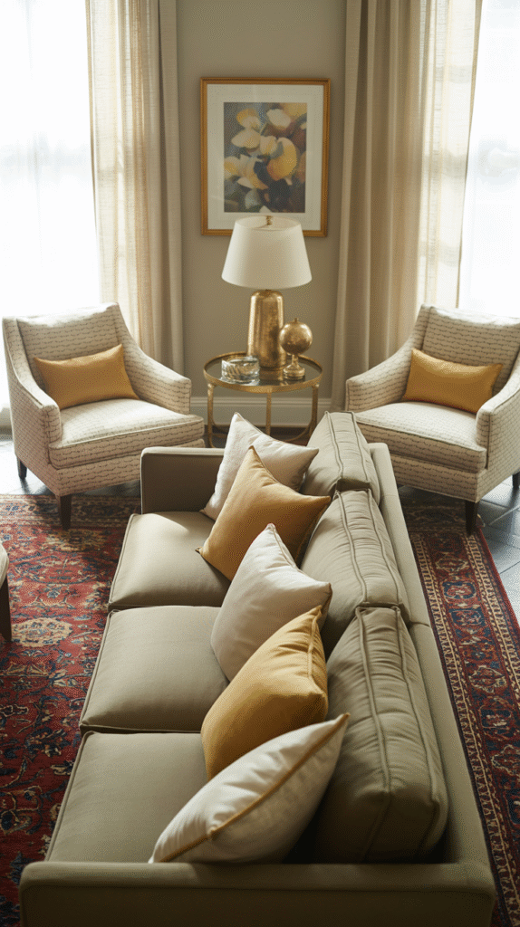 - Add a slim console table behind the sofa for style + storage.