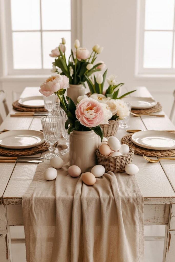 Think natural wood, neutral linens, and soft greenery. This Easter table setting feels welcoming and relaxed.