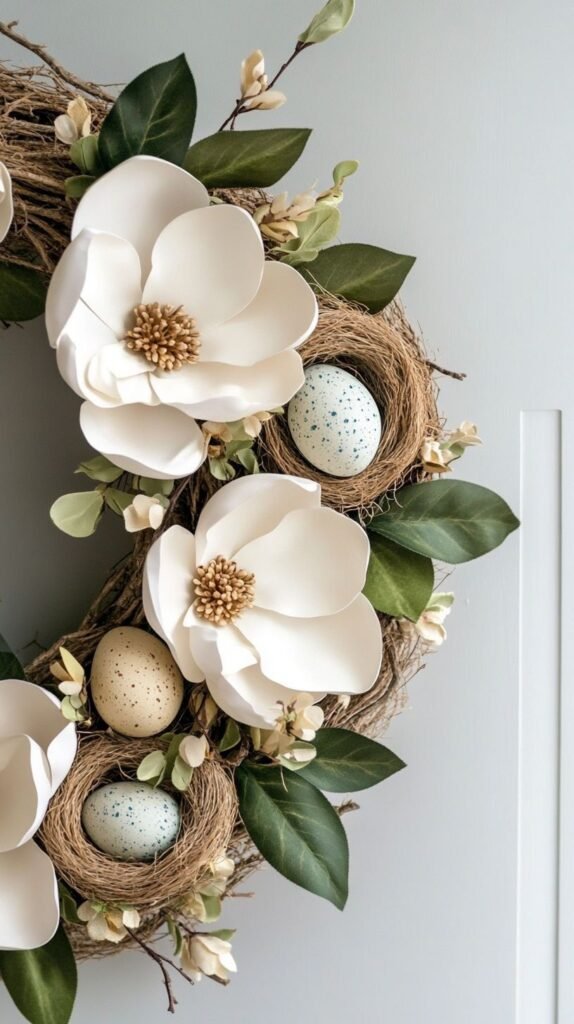 Use large hydrangea blooms in white or pale blue. Scatter speckled eggs evenly around the wreath for texture.