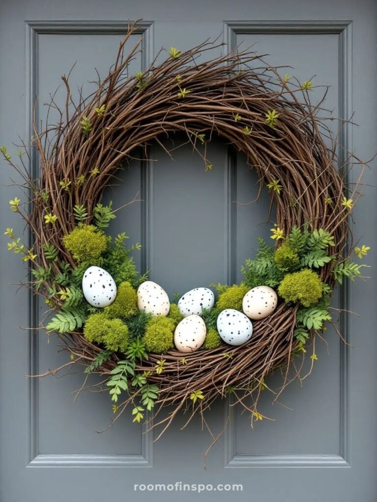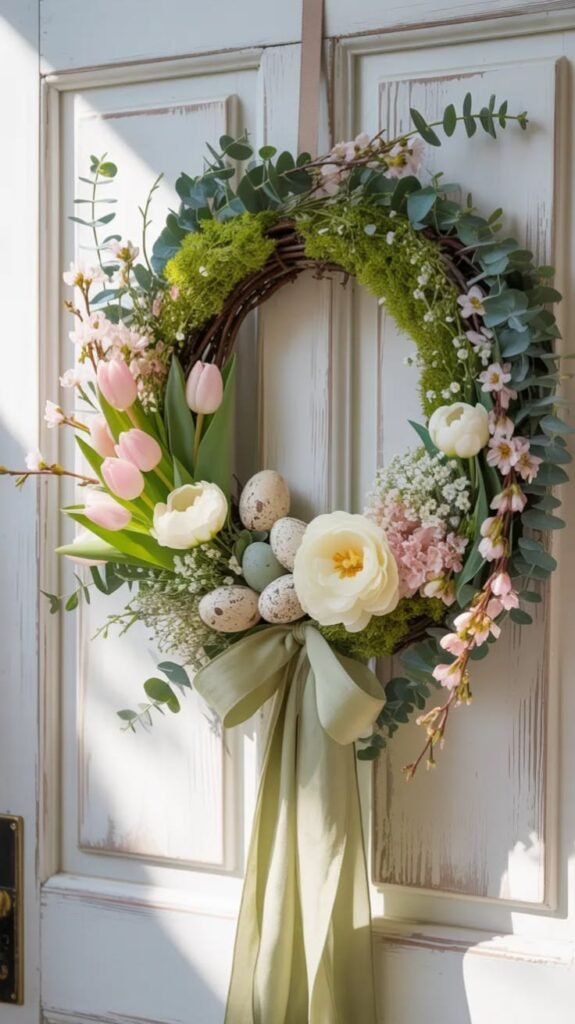 This wreath keeps it simple. Use eucalyptus, olive branches, or boxwood. Add a tiny cluster of white eggs for a subtle Easter touch.