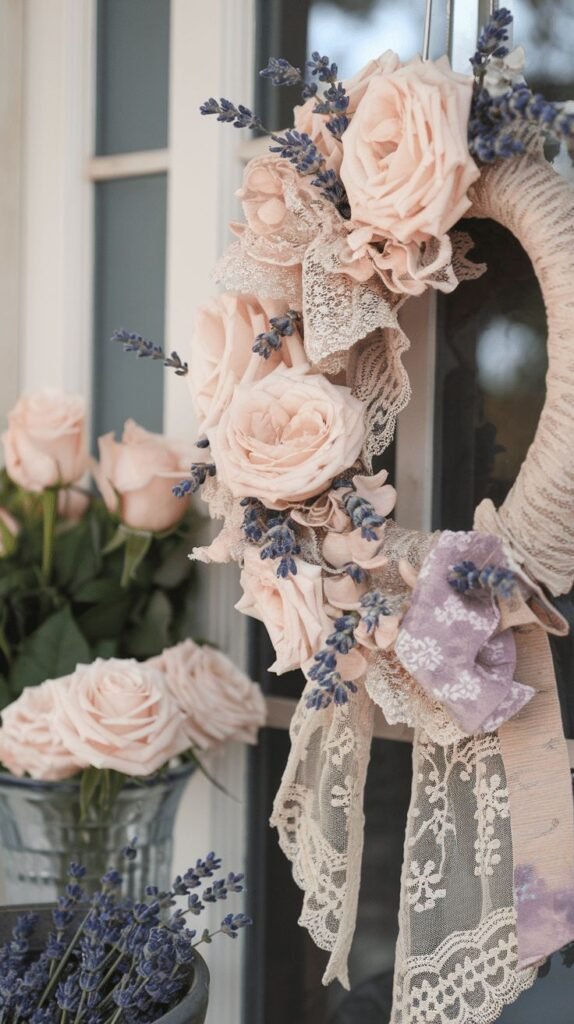 Picture a grapevine base layered with soft pink peonies, white hydrangeas, and hints of lavender. Add subtle greenery and maybe a small bow in blush or cream.