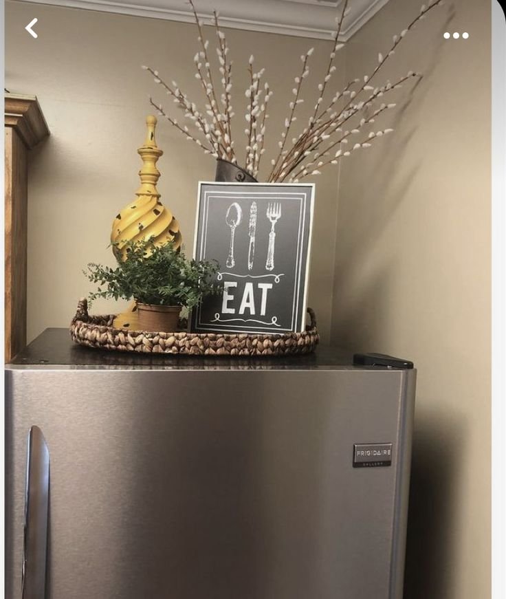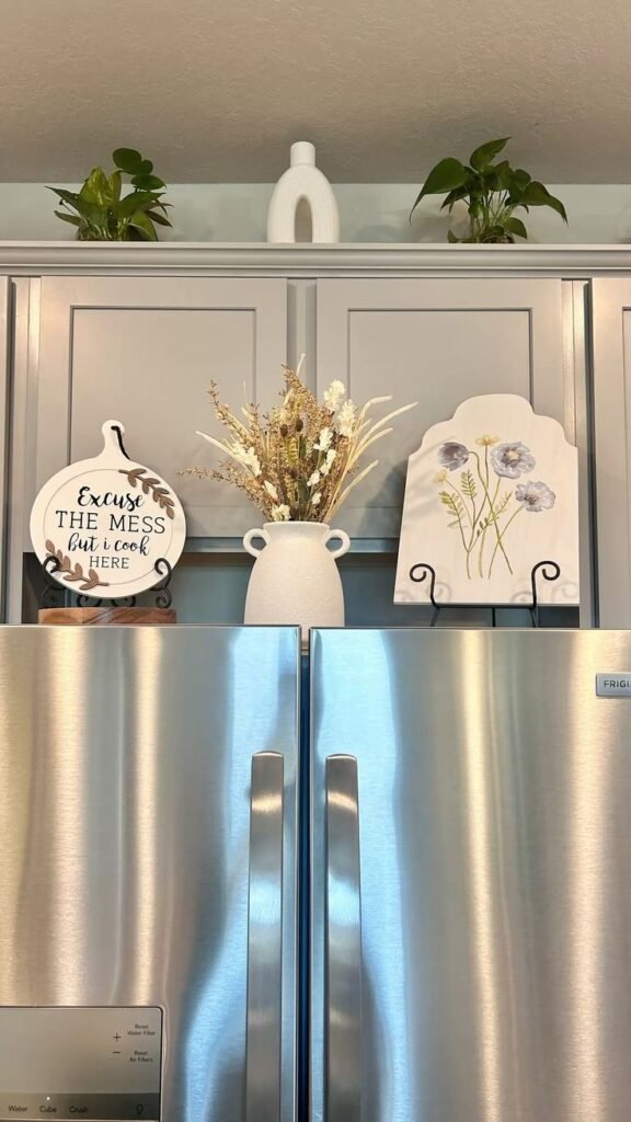 This is one of my go-to top of fridge decor ideas when I want something simple but impactful.