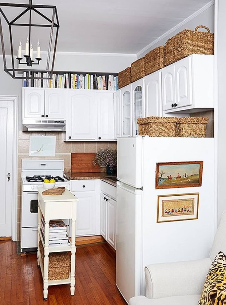I love woven baskets on top of the fridge. They add texture instantly and hide awkward gaps like a pro.