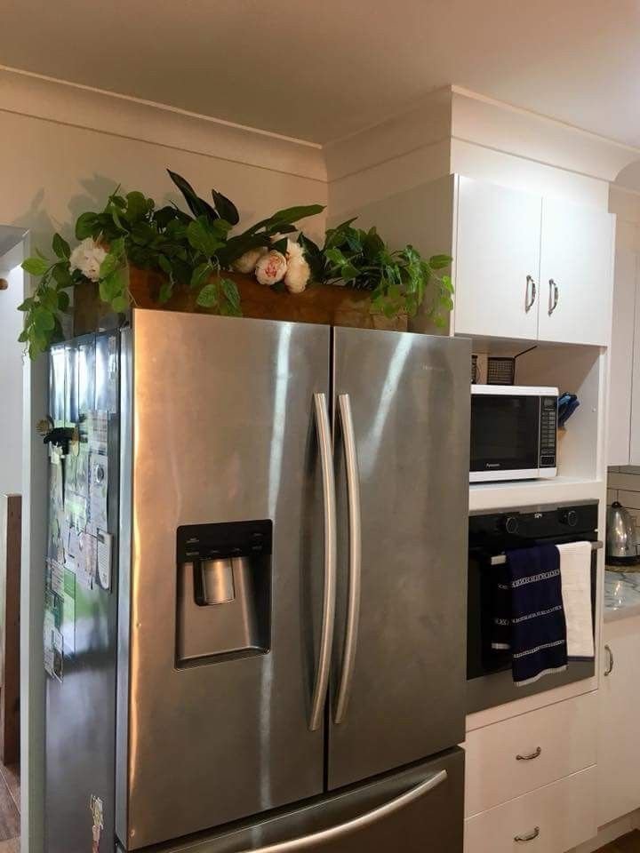 According to my experience, tall faux plants work best on top of the fridge because nobody wants to water something they can’t reach easily. I like trailing plants too, as long as they don’t hang too low.