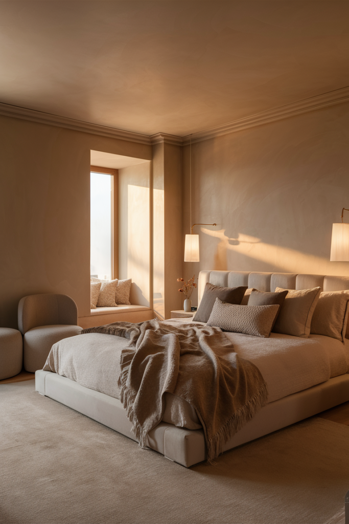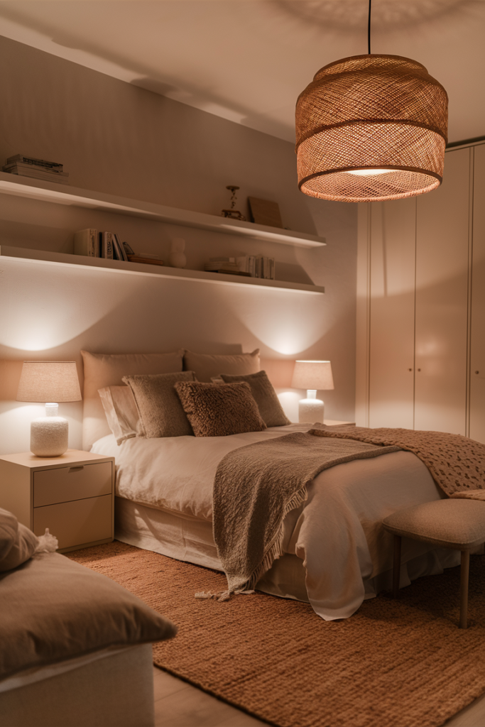 Lighting in a neutral bedroom is everything. Harsh blue lights? Instant nope. Go warm, soft, and layered.