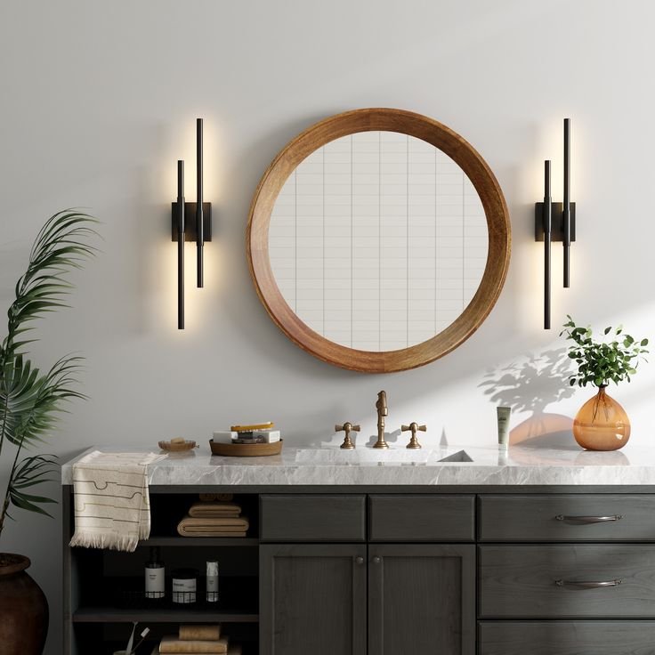 Lighting doubles as decor. I like vertical LED sconces for modern bathrooms.