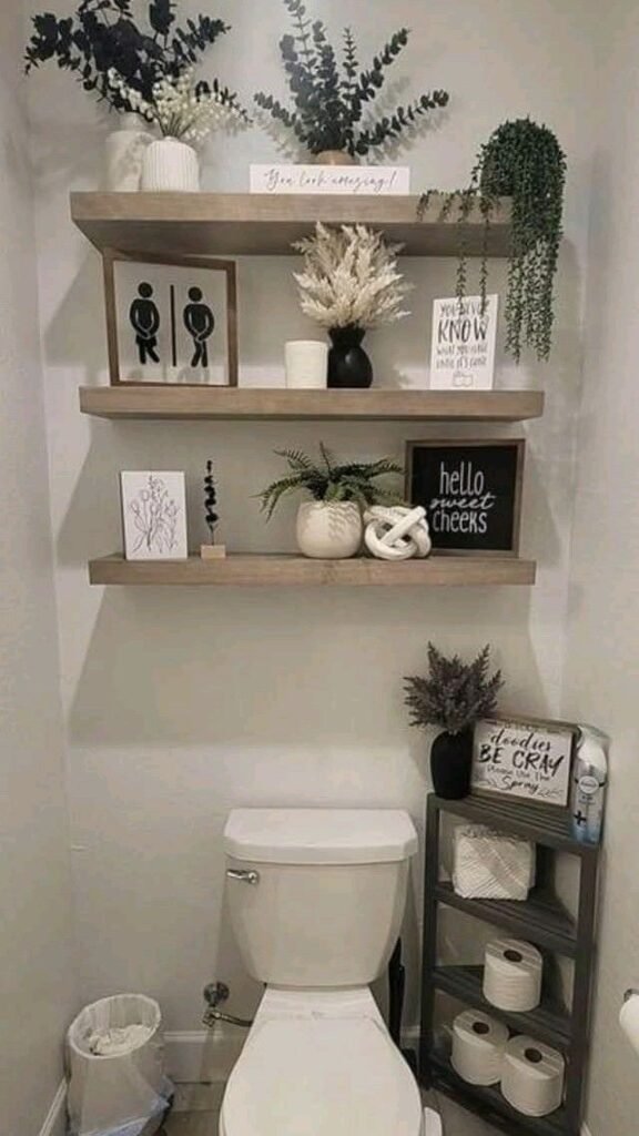 Floating shelves rank high on my list of bathroom wall decor ideas for a stylish upgrade because they work hard and look good doing it.