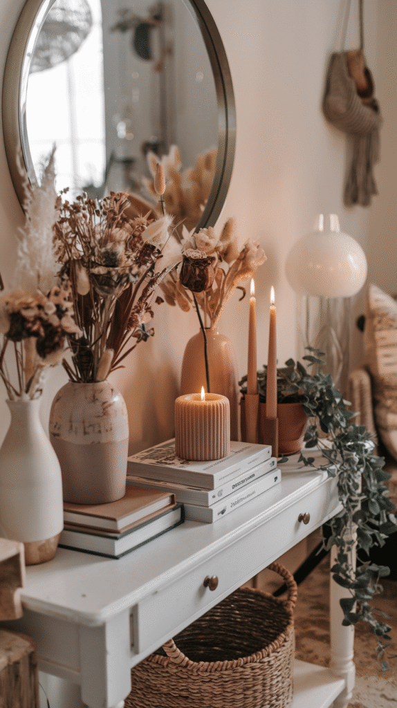 • Vases + flowers → Adds dimension and softness