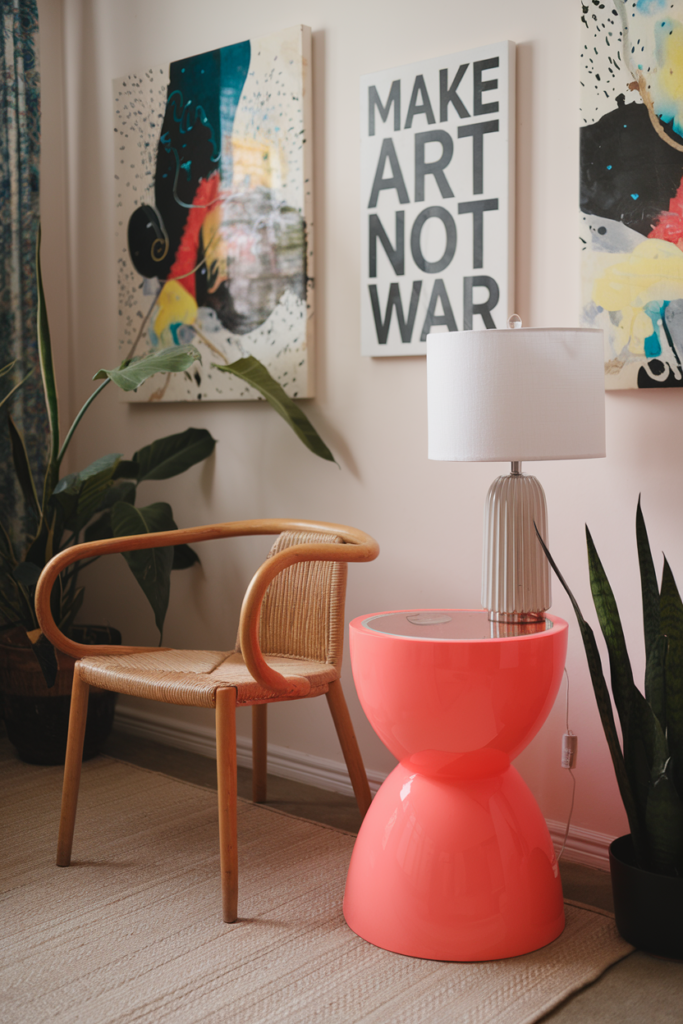 Thrifted furniture is your BFF for DIY home aesthetics. I snagged a $10 side table and gave it a neon pink facelift. Now it’s the star of my living room.