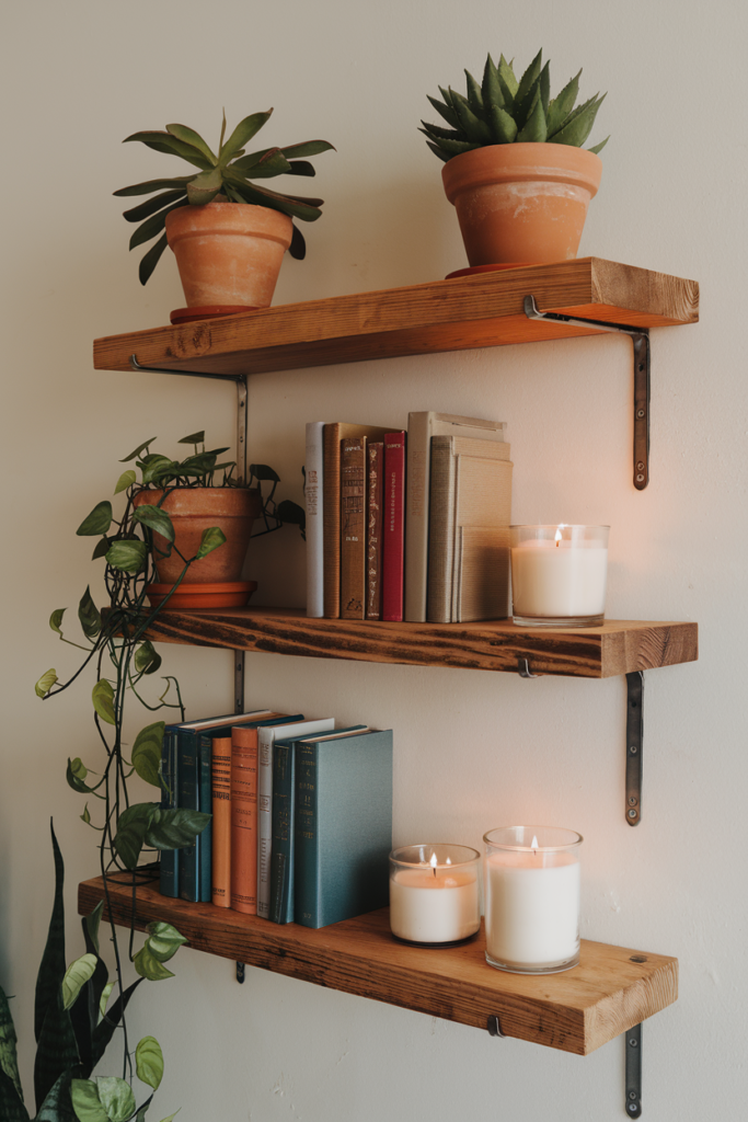 Floating shelves are both practical and pretty—perfect for DIY home aesthetics. I built some for my plants, and now my room feels like a jungle (in a good way).