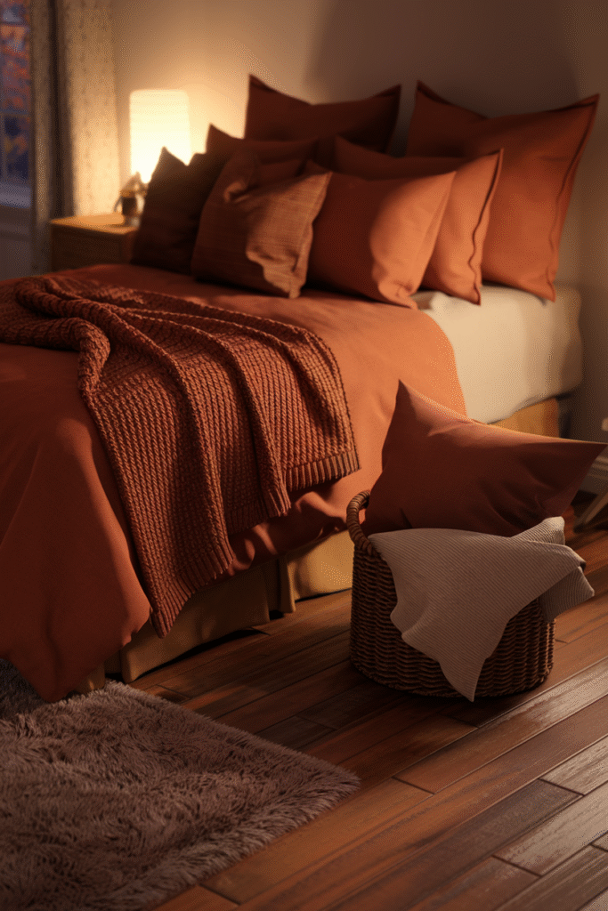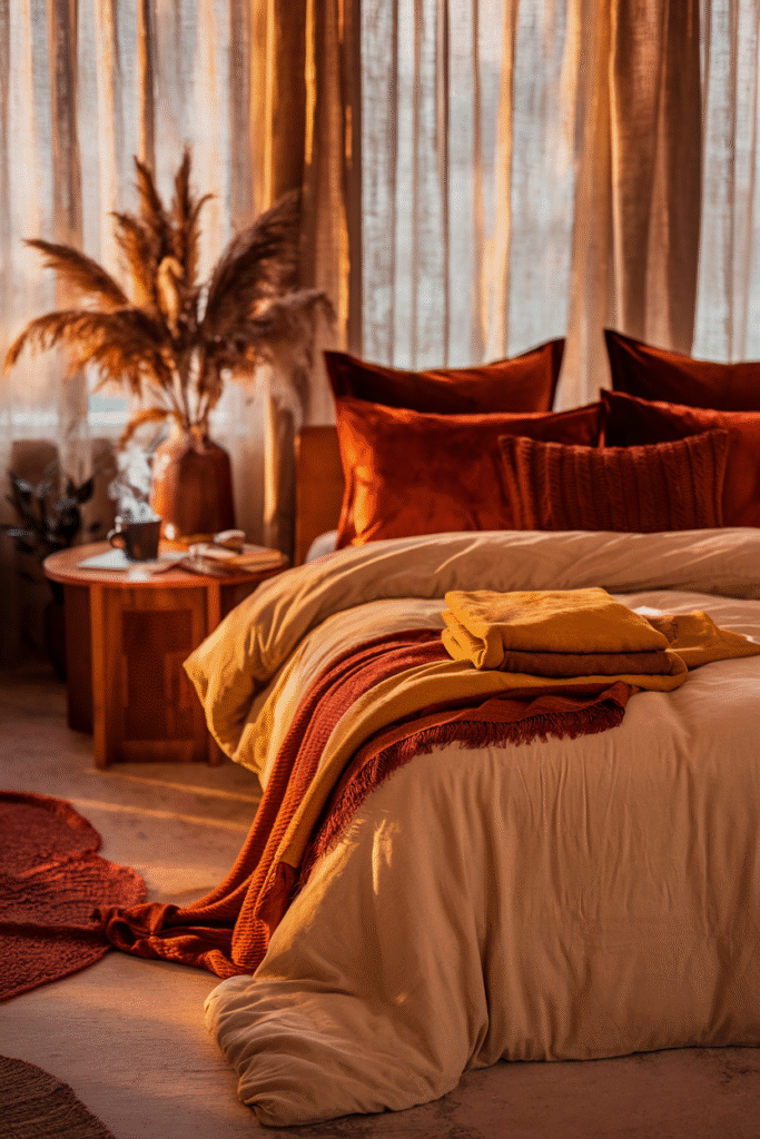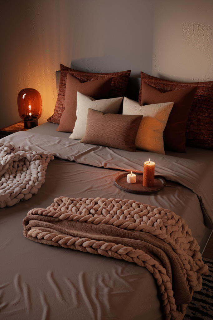 Every fall, I swap my crisp white summer sheets for a deep taupe set, pile on two chunky throws (one knit, one faux fur), and scatter five pillows in shades of rust, cream, and chocolate. I add a low-watt amber bulb in my bedside lamp, light a cinnamon candle, and instantly — my bedroom feels like an autumn retreat.