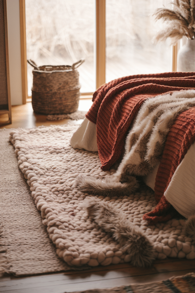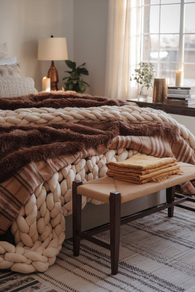 Also, don’t sleep on color psychology. A warm-toned throw (like rust, mustard, or deep cranberry) can make your whole bedroom feel warmer visually.