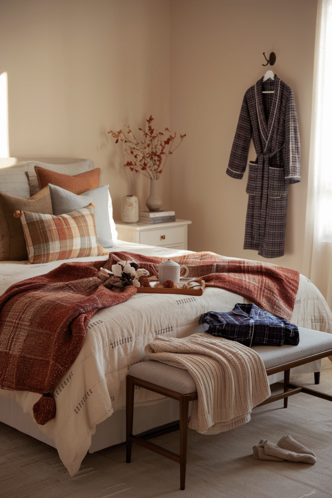 Fall bedroom comfort doesn’t stop at the bed. Soft flannel pajamas, chunky knit socks, and a plush robe make lounging feel like a luxury.