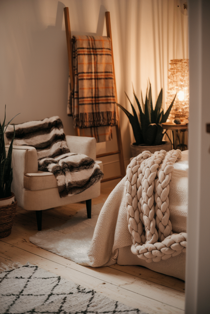 - Finish with a throw – Adds texture and extra warmth when needed.