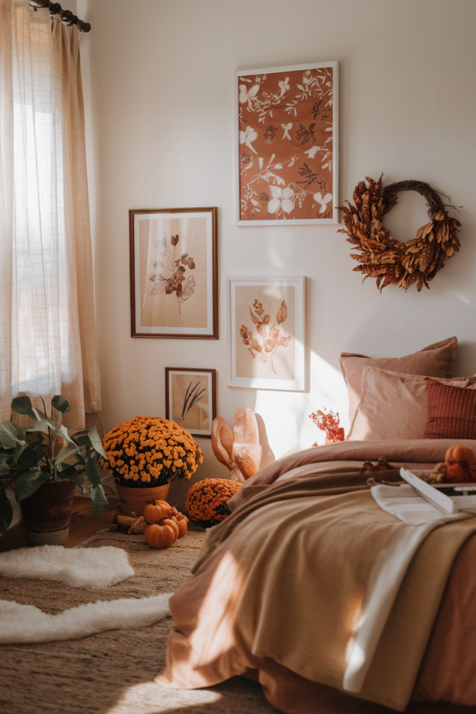 Seasonal wall art is a low-cost, high-impact way to update your bedroom. Frame printable art with fall quotes, hang dried floral wreaths, or swap your current wall hangings for woven or macrame textures.