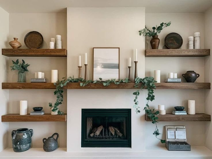 I keep shelf decor minimal so the mantel still feels like the anchor.