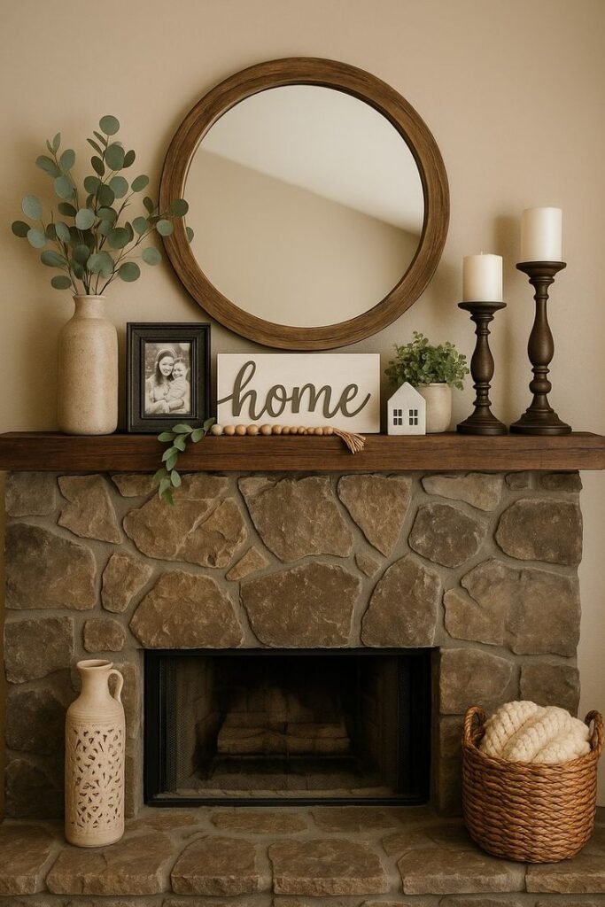 13. Farmhouse Mantel Styling That Feels Authentic