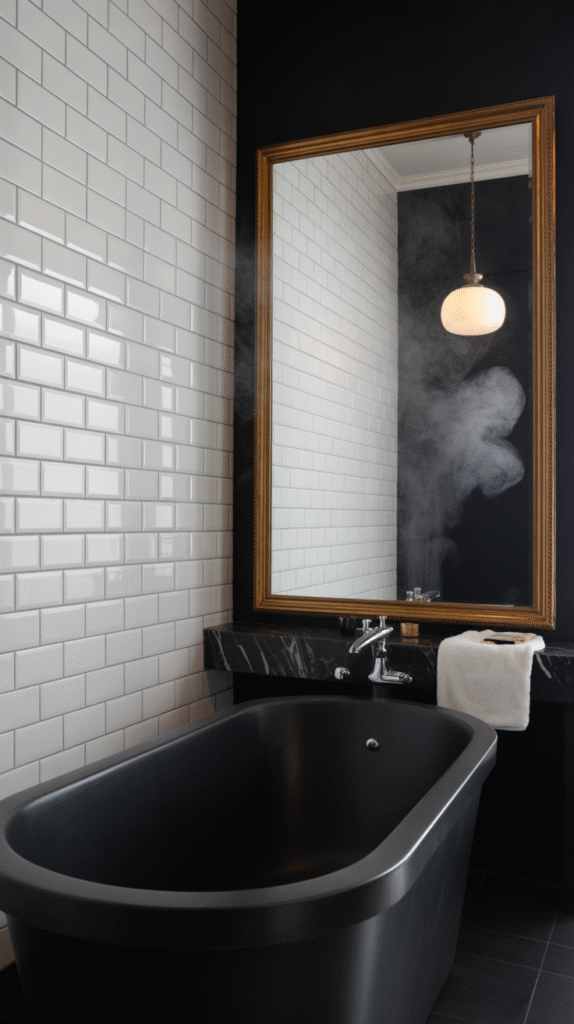 Let’s talk walls. If you’re ready to go all-in with black bathroom decor ideas, the walls are the perfect place to start.