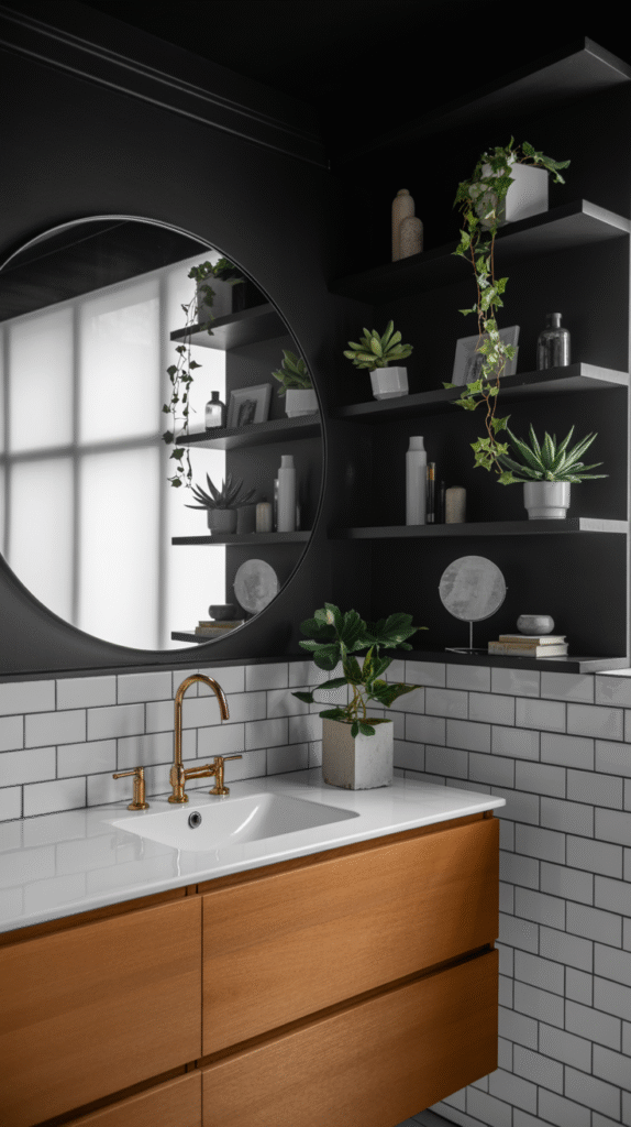 - Add wood accents (think shelves or a vanity) for warmth.