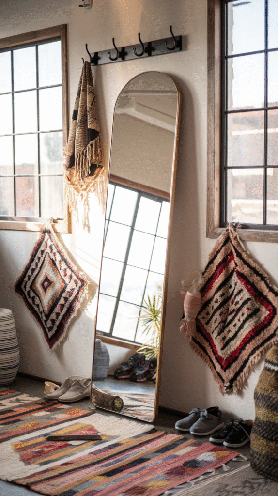 Try styling your mirror setup with textured elements like a jute rug, woven basket, or ceramic vase. Texture keeps things interesting and stops everything from looking too “catalog-y.”