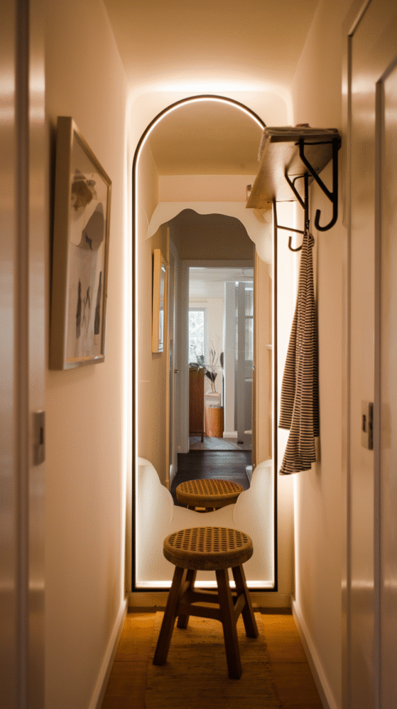 If you have the wall space, go big. A full-length mirror not only lets you check your whole outfit, but it also adds a serious sense of grandeur. Bonus points if it has a dramatic frame or leans casually against the wall like it doesn’t care how fabulous it is.