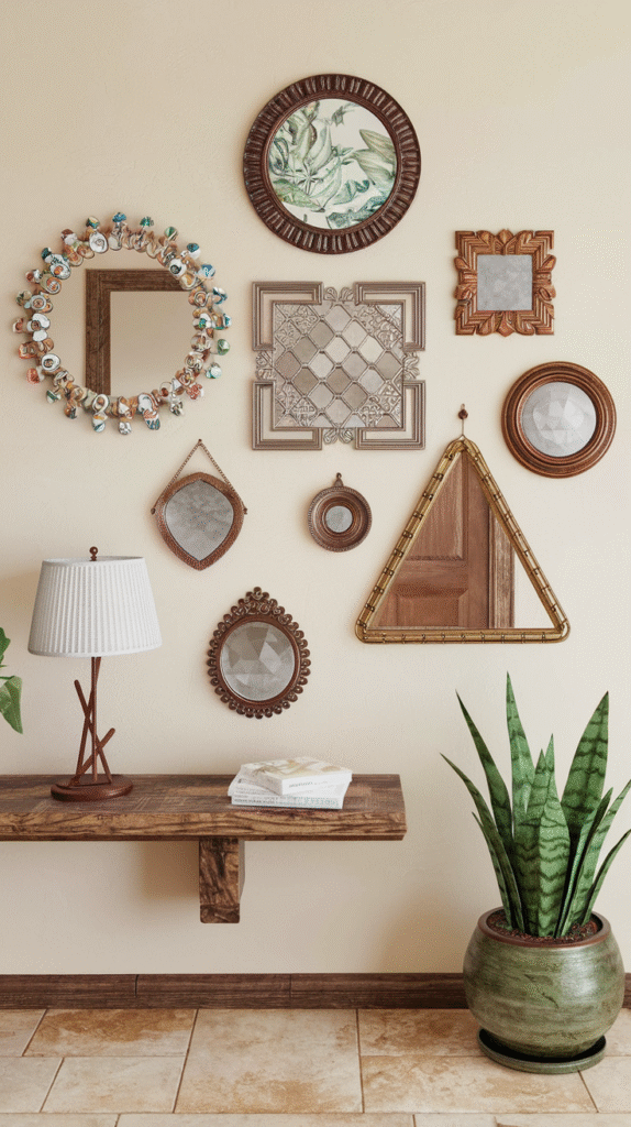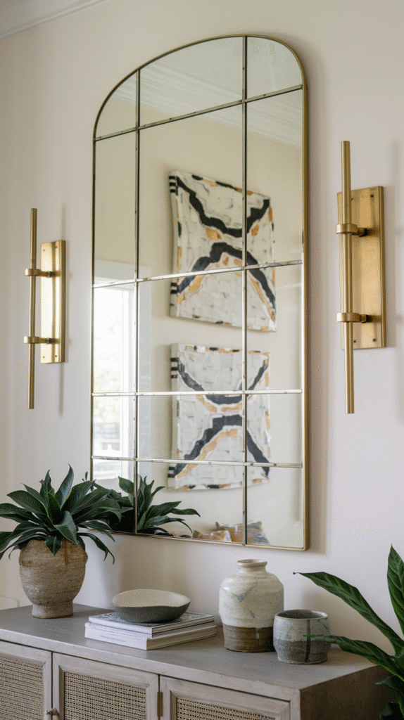 Don’t be afraid to overlap the mirror with framed prints, sconces, or vases. It adds depth and shows you know what you’re doing (even if you’re totally winging it).