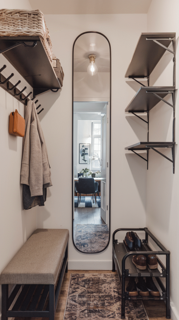 This grounds the mirror visually and gives you a surface to style with trays, baskets, or seasonal decor. Plus, a bench means you can actually sit to tie your shoes. Functional AND cute.
