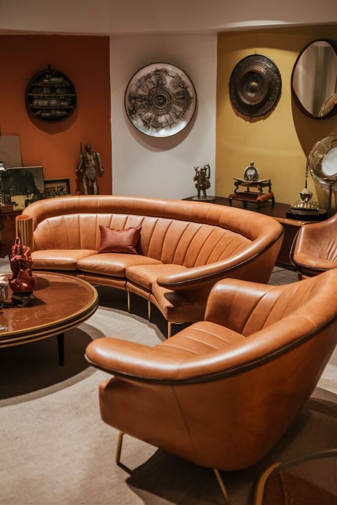 - Furniture: Think curved sofas, rounded coffee tables, and scalloped headboards.