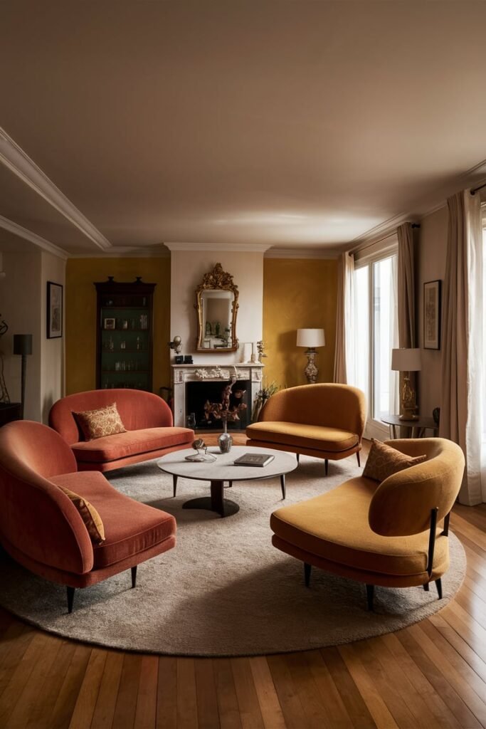 - Curved sofas and velvet chairs